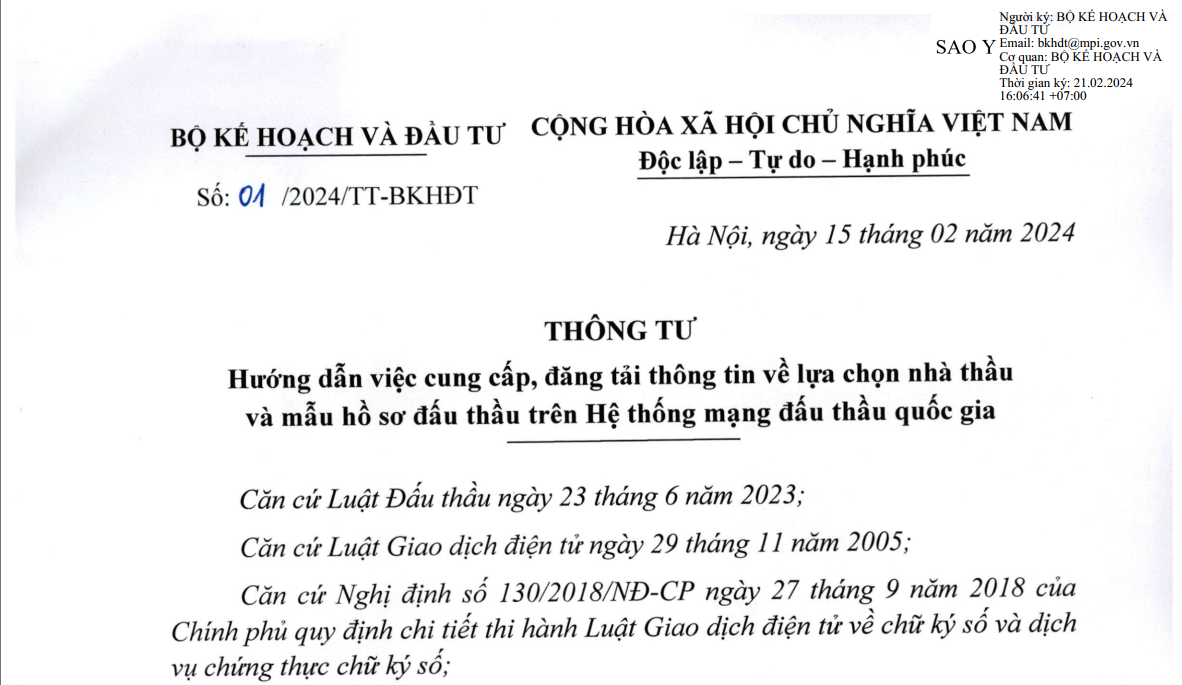 Thông tư số 06/2024/TT-BKHĐT Hướng dẫn việc cung cấp, đăng tải thông tin về lựa chọn nhà thầu và mẫu hồ sơ đấu thầu trên Hệ thống mạng đấu thầu quốc gia