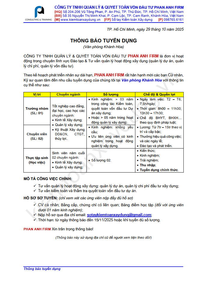 Thông báo tuyển dụng Kỹ sư và Thực tập sinh tại Chi nhánh Khánh Hòa 2025