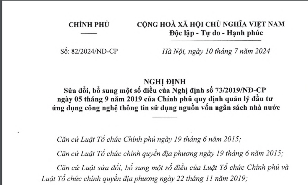 Nghị định số 82/2024/NĐ-CP Sửa đổi, bổ sung quy định quản lý đầu tư ứng dụng công nghệ thông tin sử dụng nguồn vốn ngân sách nhà nước