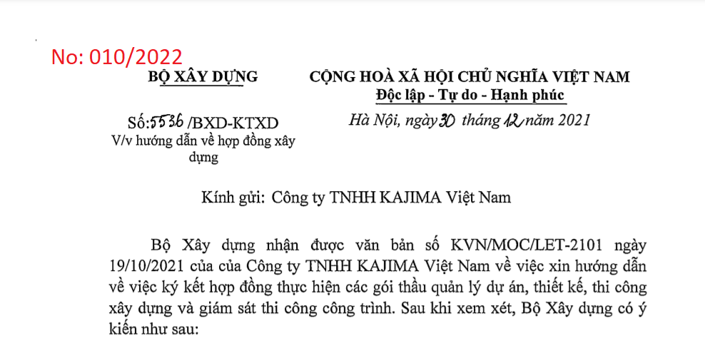Ngày 30/12/2021, Bộ Xây dựng đã có công văn 5536/BXD-KTXD gửi Công ty TNHH KAJIMA...