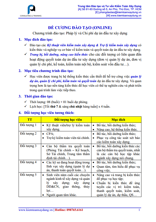Đề cương khóa học (căn bản): Pháp lý và chi phí dự án đầu tư xây dựng (Vốn Nhà nước)