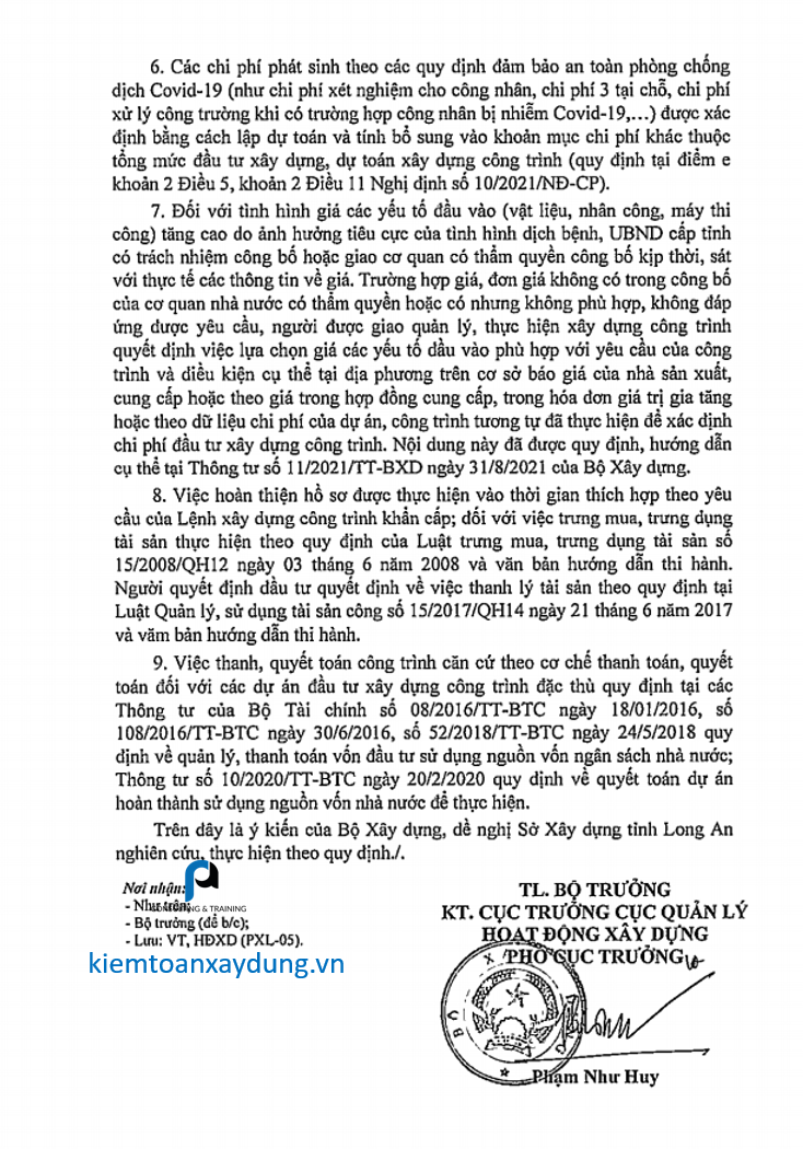 Ngày 27/9/2021, Bộ Xây dựng đã có công văn 3988/BXD-HĐXD gửi Sở Xây dựng tỉnh Long An về việc hướng dẫn triển khai xây dựng công trình Bệnh viện dã chiến sử dụng vốn đầu tư công theo Lệnh xây dựng công trình khẩn cấp.