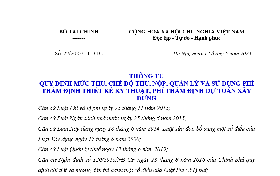 Thông tư số 27/2023/TT-BTC quy định mức thu, chế độ thu, nộp, quản lý và sử dụng phí thẩm định thiết kế kỹ thuật, phí thẩm định dự toán xây dựng