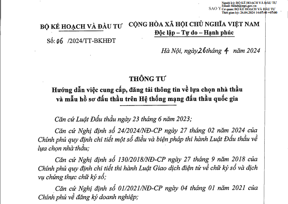 Thông tư số 06/2024/TT-BKHĐT Hướng dẫn việc cung cấp, đăng tải thông tin về lựa chọn nhà thầu và mẫu hồ sơ đấu thầu trên Hệ thống mạng đấu thầu quốc gia