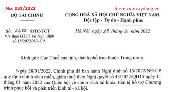 Văn bản số 2688/BTC-TCT ngày 23/03/2022 của Tổng cục thuế hướng dẫn lập hóa đơn theo Nghị định số 15/2022/NĐ-CP