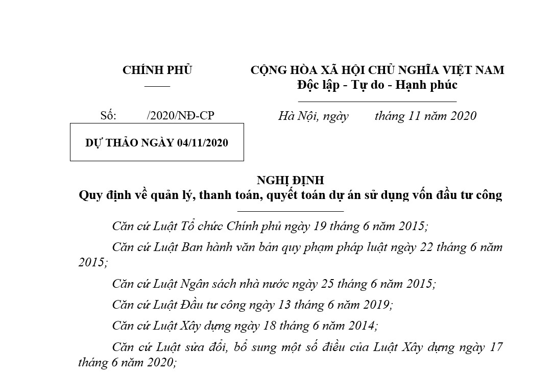 Dự thảo Nghị định quy định về quản lý, thanh toán, quyết toán dự án sử dụng vốn đầu tư công